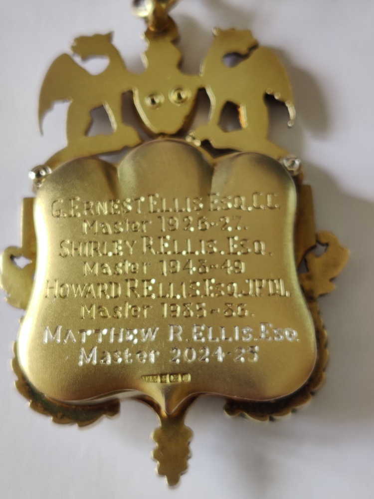 I have had the most fantastic 12 months as your Master and I would like to thank the Court for putting their faith in me and I would like to thank the Livery as a whole for their support throughout the year. Nettie and I have met so many new friends and attended events that in the normal course of life you just wouldn’t get the opportunity to attend. At my last Court meeting at Sadlers Hall on Friday I was honoured to have been presented with my Past Masters badge once I had handed over to the new Master. This badge was first presented to my great grandfather George Ernest Ellis and has subsequently been used by my grandfather Shirley and my father Howard. The photos show the front and back of the jewel.