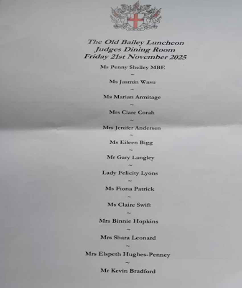 I was very privileged to be invited to the Old Bailey by Kevin Bradford, Consort to Sheriff & Deputy Keith Bottomley, on Friday 21st November 2025 along with, Mr Gary Langley Mayoral Consort to Alderwoman Dame Susan Langley DBE during her term as Lady Mayor, Mrs Elspeth Hughes-Penny, Consort to Alderman and Sheriff Robert Hughes-Penney and ten other guests.